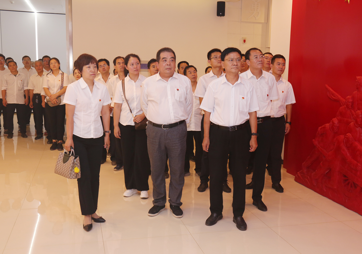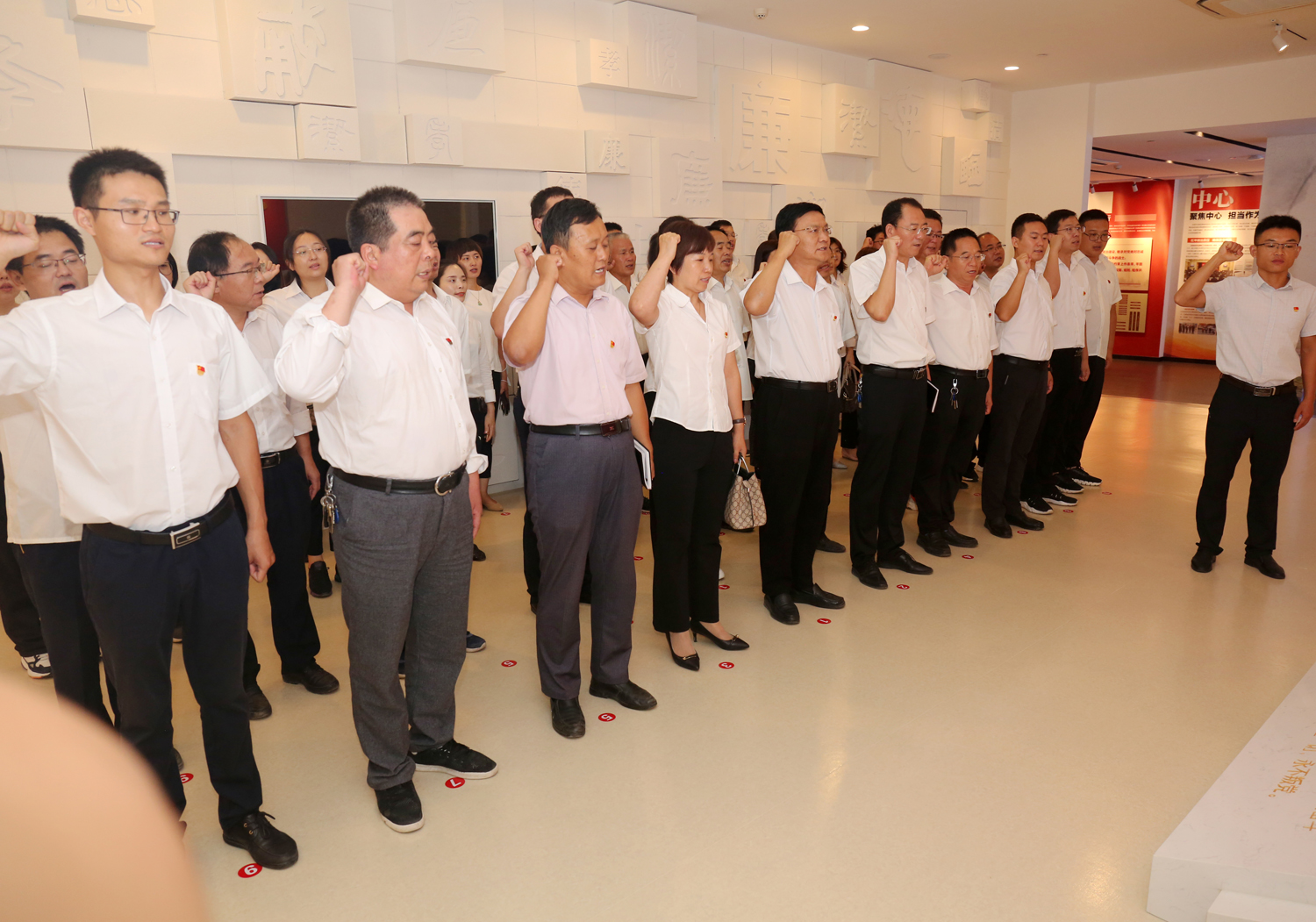 參觀結(jié)束后,全體黨員干部來到尾廳,面對鮮紅的黨旗莊嚴(yán)宣誓,用飽滿的熱情重溫了入黨初心。