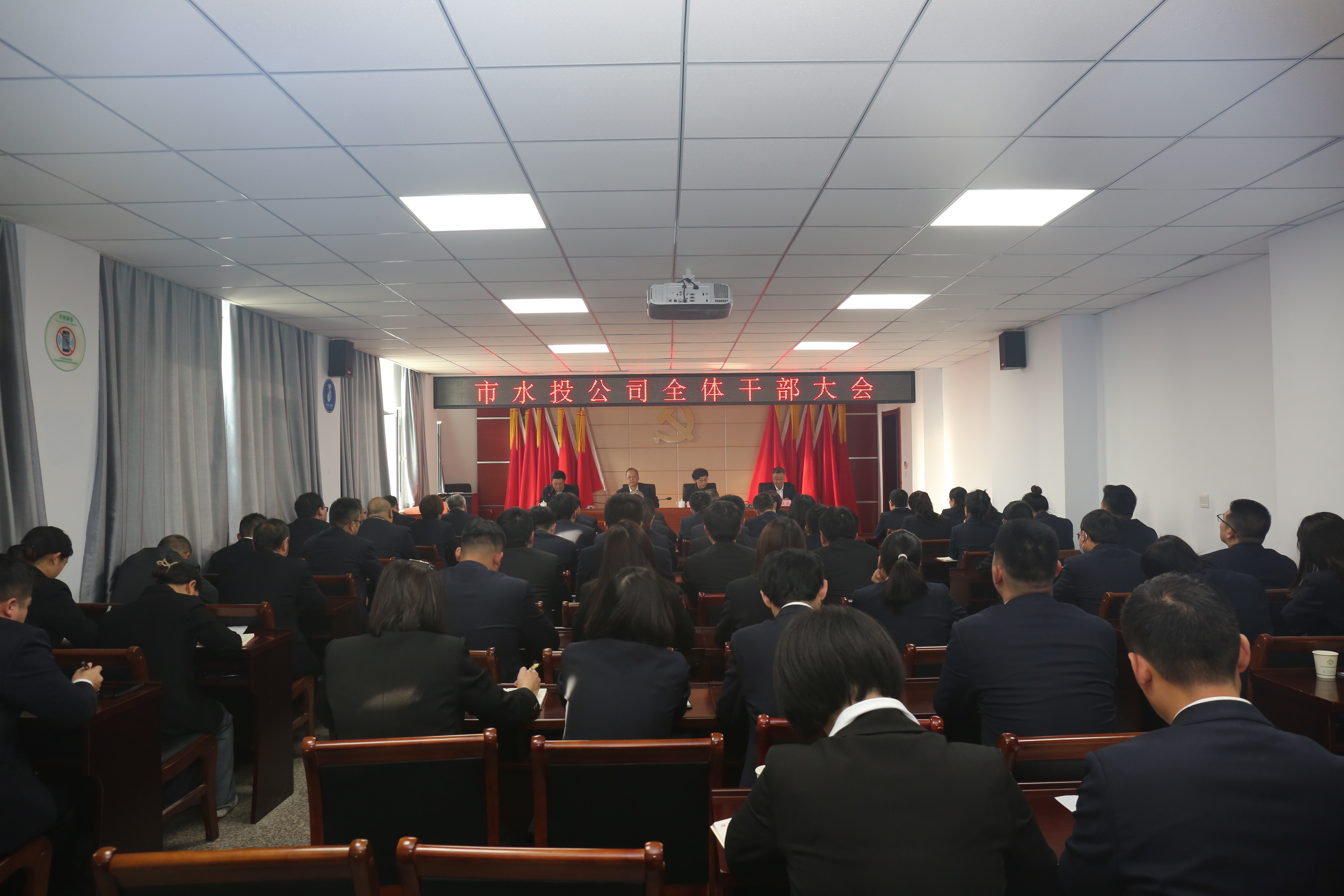 10月27日下午,市水投公司召開全體干部大會。市委常委、副市長董旭光,市委組織部副部長、市委老干部局局長丁文玲出席會議并講話。公司黨委書記、董事長崔作銘主持會議。公司黨委班子成員、全體干部職工及子公司班子成員參加會議。