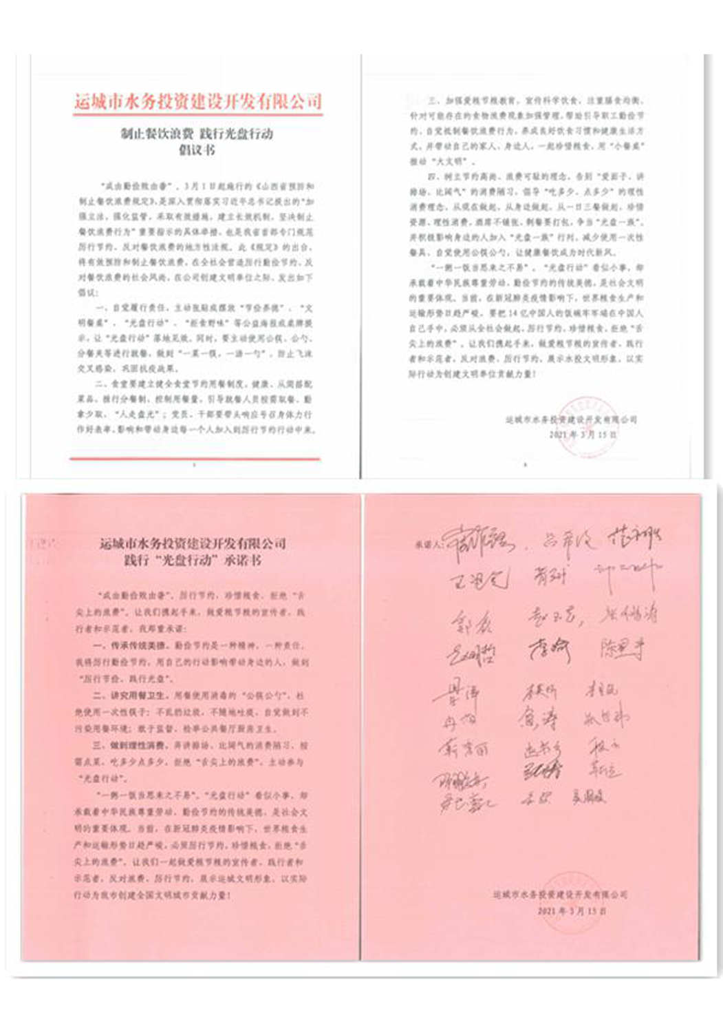 為響應中央、省、市堅決制止餐飲浪費行為的號召,水投公司積極按文件要求,采取多種形式進行宣傳落實。3月16日,公司以“制止餐飲浪費、踐行光盤行動”為主題,組織開展了系列活動,在公司及項目公司餐廳張貼公益海報,在公司大廳一樓大屏幕播放宣傳語。同時,在公司微信群發(fā)送了制止餐飲浪費、踐行光盤行動倡議書及承諾書,全體干部職工紛紛響應,簽署了《制止餐飲浪費、踐行光盤行動承諾書》。